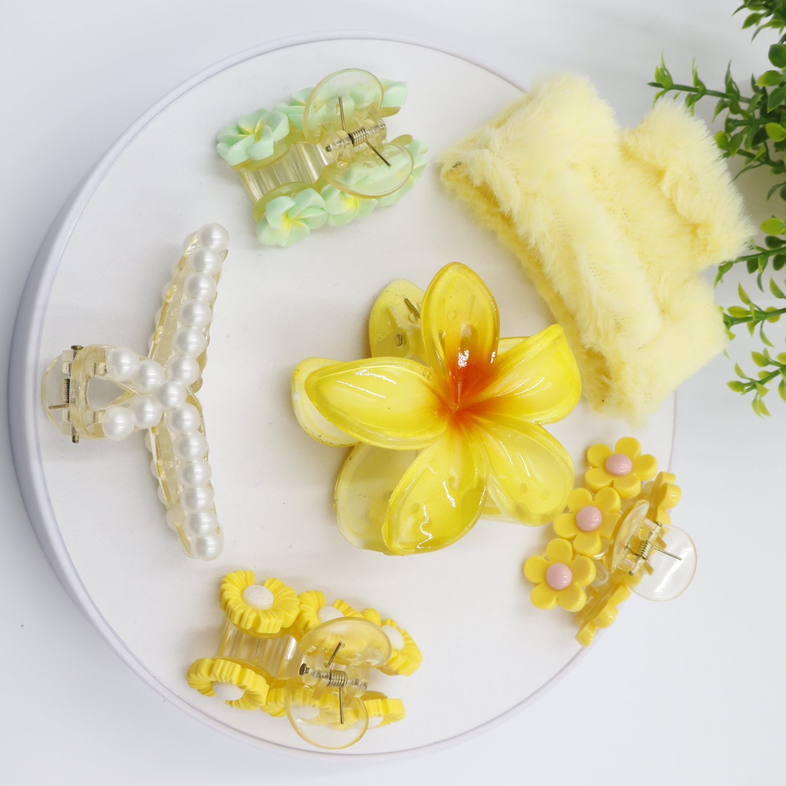 Combo Pack of 6- Includes pearl, fur, and flower claw clips.